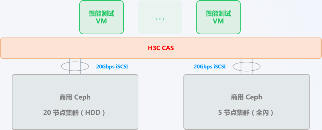 本次测试基于用户正在使用的 H3C CAS 虚拟化平台,使用 SmartX 分布式块存储 SMTX ZBS(以下使用 “SMTX ZBS”)与现有方案使用的某商用 Ceph-based 分布式存储产品(以下简称 “商用 Ceph 存储”)进行性能对比,通过以直接的存储性能测试与模拟关键数据库应用的方式了解 SMTX ZBS 在此场景的适用性与性能指标。