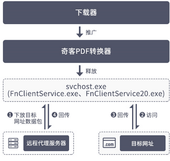 近期,火绒接到许多用户反馈称电脑会莫名卡顿,CPU占用率高,且如下进程svchost.exe、FnClientService.exe、FnClientService20.exe之一会访问大量的陌生网址。经分析发现,用户电脑出现此现象正是由于安装奇客PDF转换器所导致的。该恶意软件与先前分析过的流星加速器类似(“流星加速器”恶意投毒控制用户电脑 恐用于商业牟利),都是通过下载站下载器进行静默传播推广。在该恶意软件安装过程中会释放恶意代理模块到%appdata%\tx目录。即使用户卸载奇客PDF转化器,恶意代理模块也不会随之删除,而是作为系统服务,开机自启,永久的驻留在用户电脑之中。虽然不同版本的奇客PDF转换器释放的恶意代理模块名称不同,但是功能代码极为相似,下文以svchost.exe分析说明。相关运行流程如下图所示: