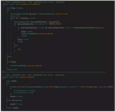 奇客PDF转化器运行后,会在用户%appdata%目录下创建tx文件夹,将相关代理模块释放于其中。随后运行start.bat脚本,该脚本根据用户电脑的.NET环境来决定运行Start2.0.exe还是Start4.0.exe。Start2.0.exe/Start4.0.exe运行之后会遍历系统服务,如果不存在名为“SDRSVC_93c83”的服务或该服务没有正在运行则启动相应目录下的svchost.exe。相关代码如下图所示: