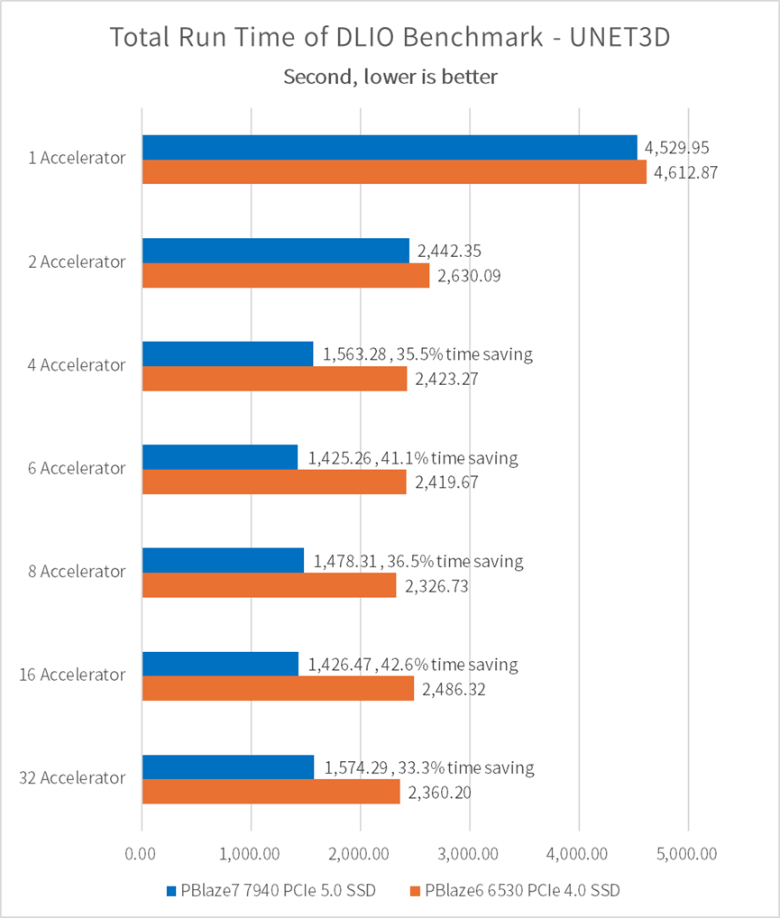 • 相比 PCIe 4.0 SSD,单片 PBlaze7 7940 PCIe 5.0 SSD 可以让训练环节减少耗时 1,000秒;