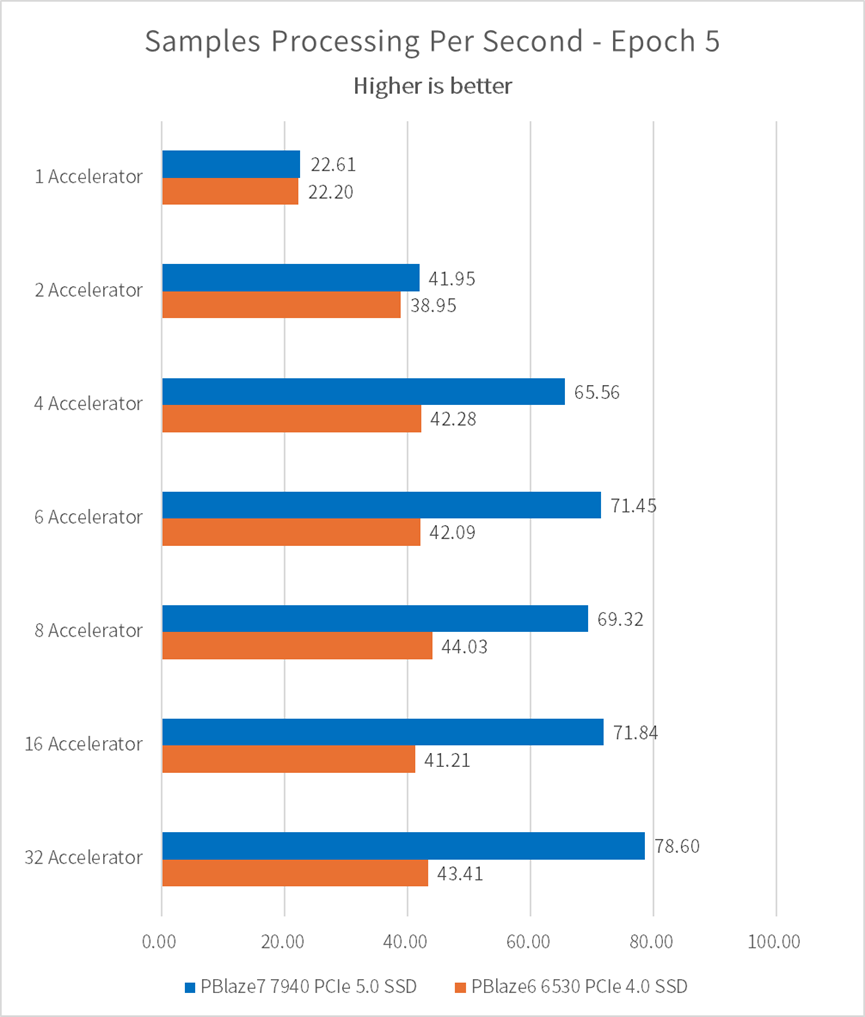 在 epoch=5 的情况下,通过配置单片 PBlaze7 7940 PCIe 5.0 SSD,可以在4颗或更多 GPU 的训练任务中,相比 PCIe 4.0 SSD 节省近1,000秒的时间。我们假设80个 epoch 为一次完整训练,节省时间则可以达到 16,000秒,并在80次完整训练下节省14.8天!