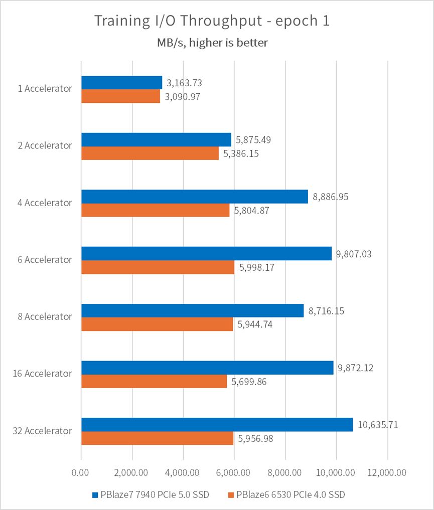 当加速器(GPU)数量设置为1时,由 PBlaze7 7940 PCIe 5.0 SSD 和 PBlaze6 6530 PCIe 4.0 SSD 构成的训练平台均可以带来 3.1GB/s 的 I/O 性能。根据平均样本文件体积 146MB、每个加速器一次加载样本数量32个,以及 V100 GPU 的计算环节代替参数,可得出加速器理论处理上限为 3400MB/s,远没有达到 SSD 和系统内存的读带宽。因此,我们可以继续增加加速器(GPU)的数量,在不增加服务器的情况下继续提升训练性能。