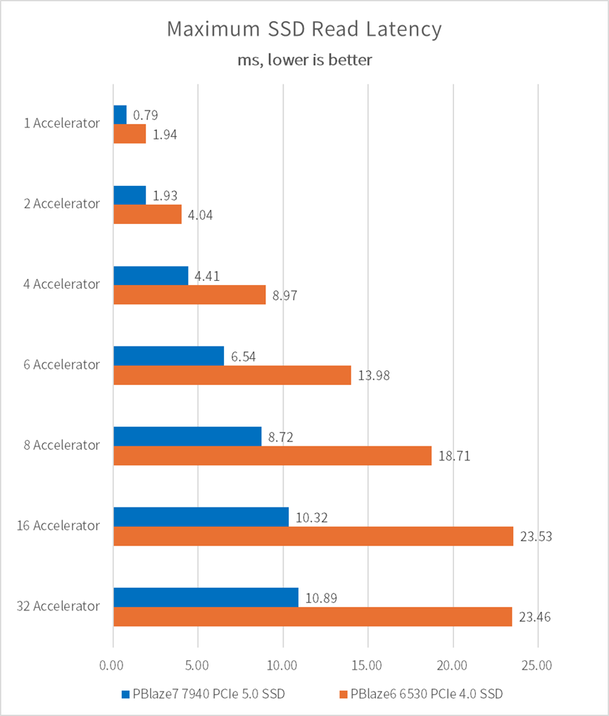 • 单片 PBlaze7 7940 PCIe 5.0 SSD 可以在吞吐量较高的模型训练任务中,为多颗 GPU 配置带来优秀的 I/O 传输带宽,性能领先 PCIe 4.0 SSD 达 81%;