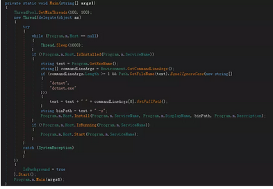 svchost.exe运作之后会将自身注册为服务并启动运行,相关代码如下图所示: