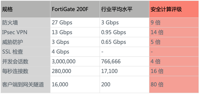 安全计算评级显示,FortiGate -200F的IPsec VPN 性能比行业平均水平高出 14 倍,充分凸显了Fortinet SOC4 SD-WAN ASIC为客户带来的性能优势。