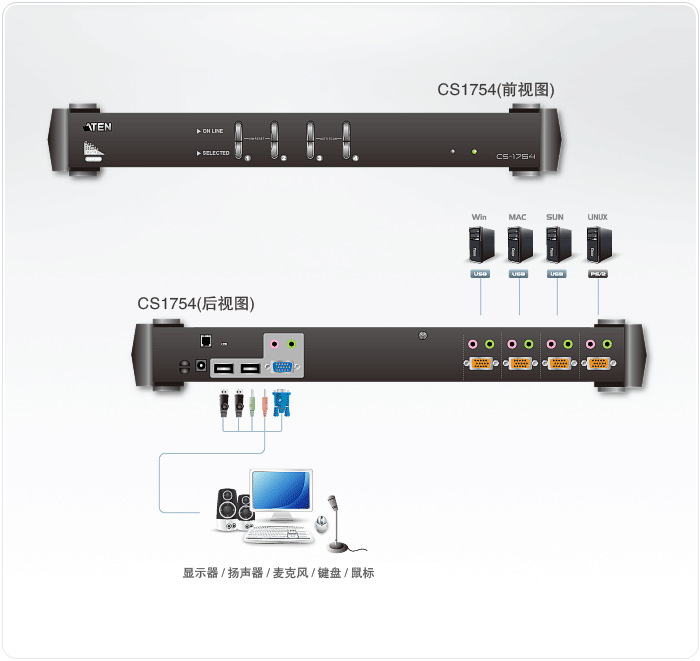 CS1754 USB KVM(键盘、显示器、鼠标)多电脑切换器,允许用户从单一USB键盘、USB鼠标以及显