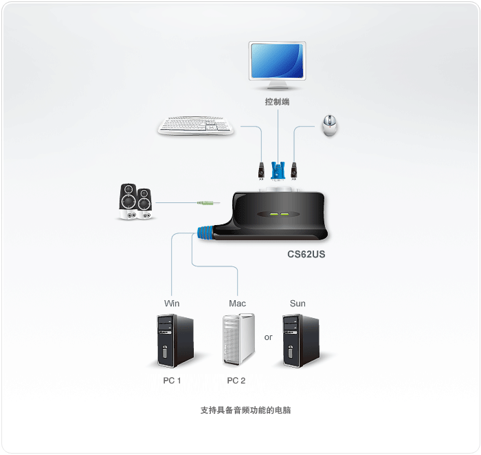 ATEN提供完整的USB KVM解决方案。CS62US可连结两台USB电脑至一台USB控制端,并兼容于所有操作系统,包括PC, Mac及Sun。