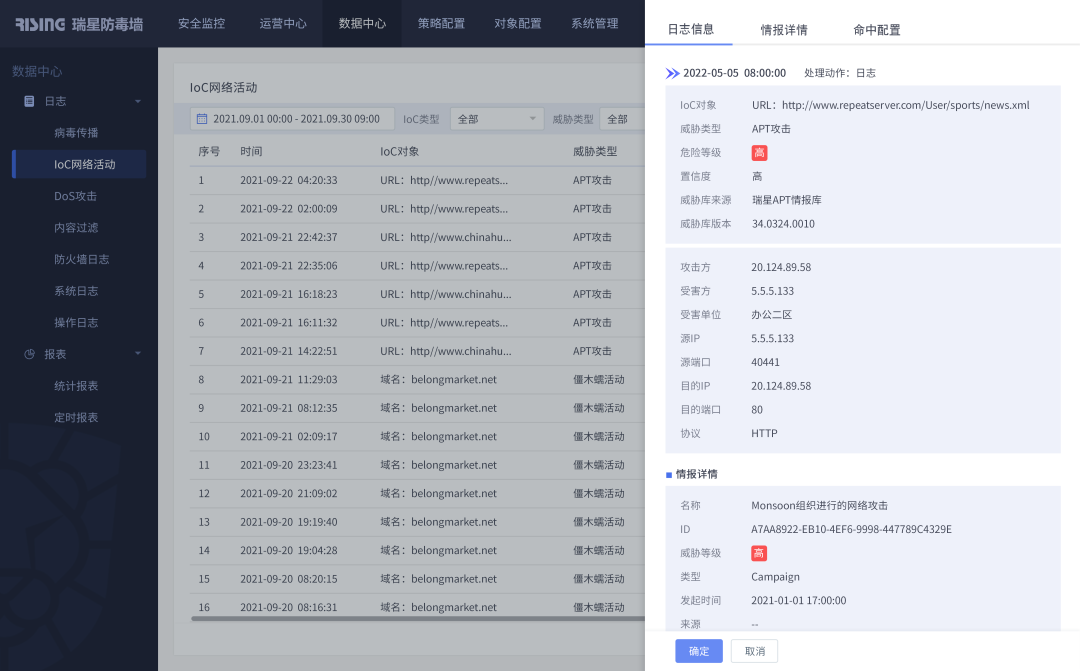 网关安全产品可利用威胁情报追溯威胁行为轨迹,帮助用户进行威胁行为分析、定位威胁源和目的,追溯攻击的手段和路径,从源头解决网络威胁,最大范围内发现被攻击的节点,帮助企业更快响应和处理。
