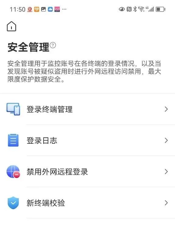 首先它有自己的全方位安全管理系统,比如查看登录日志、外网禁用设置、新设备登录认证等,再有我们也可以设置密码多重保护数据隐私安全。特别在意这一点的小伙伴时常留个心眼经常查看日志就行啦 ~