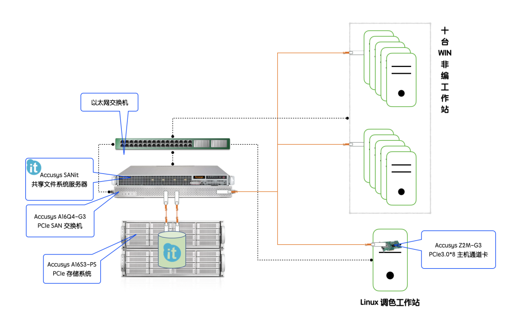 A16Q4-G3 PCIe交换机拥有已定义的12个主机客户端和4个存储客户端,可以连接Windows和Linux主机系统。上图中为Windows和Linux系统解决方案(不支持MAC,原因是SANit文件系统只支持Windows和Linux),每个非编工作站安装Z2M-G3(PCIe3.0主机卡)连接PCIe交换机。共享文件系统采用Accusys SANit2-W文件系统,整个方案Accusys提供除工作站以外的所有存储、共享文件系统及配件。满配时总体读写性能可以获得近8000MB/s。如果仅配置两台A16S3-PS,可以实现100MB无压缩高清视频,多台主机同时编辑,可达到35层。如果配置4台A16S3-PS及更多扩展柜,可以实现此格式70-80层同时编辑。