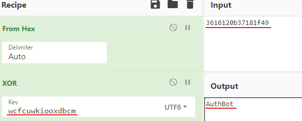 其中“wcfcuwkiooxdbcm”是之前生成的随机XOR密钥,“3616120b37181f49”异或密文,解密之后正是“AuthBot”。如下: