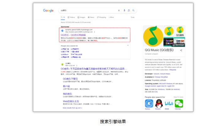 以假冒"QQ音乐"为例,在Google中搜索“QQ音乐”,搜索结果的第一名就是该病毒,如下图所示: