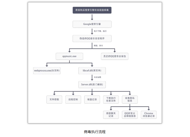 用户运行通过Google搜索引擎下载的伪装安装包之后,程序就会释放病毒文件,随后执行黑客下发的恶意行为,包括文件监控、远程控制、键盘记录、窃取QQ微信隐私信息等。该病毒执行流程,如下图所示: