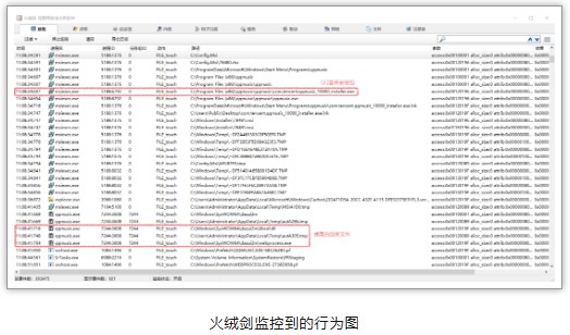 黑客所伪造的安装包命名为“QQMusic_Music.msi”。当执行该安装包后,真正的QQ音乐安装包会被释放到“C:\Program Files (x86)\qqmusic\qqmusic\”路径中,同时在桌面生成一个快捷方式。此外,病毒相关的文件会被释放到路径“C:\Windows\SysWOW64\dazui2m(随机文件夹名)”并运行。火绒剑能够监控到的行为,如下图所示: