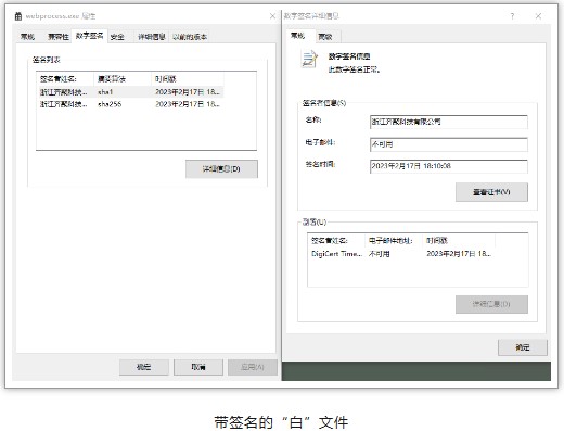 该病毒采用了"白加黑"的技术策略,以规避安全软件的检测和清除,其隐蔽性表现突出。其中“libcef.dll”是经过黑客修改的病毒文件,而“webprocess.exe”则是一个带有正规签名“白”文件。相关的签名信息,如下图所示: