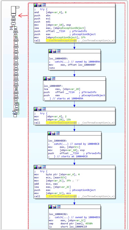 "libcef.dll" 是被黑客修改过的 DLL 文件,其主要功能是对内层的后门模块进行解密和加载。为了对抗杀毒软件查杀,该 DLL 文件采用了混淆技术。它使用了 C++ 异常以打乱正常程序的执行顺序,这也有效地干扰了安全分析人员的分析工作。这种混淆方法能够阻止 IDA 插件的 "反编译" 功能,混淆后的执行流程,如下图所示: