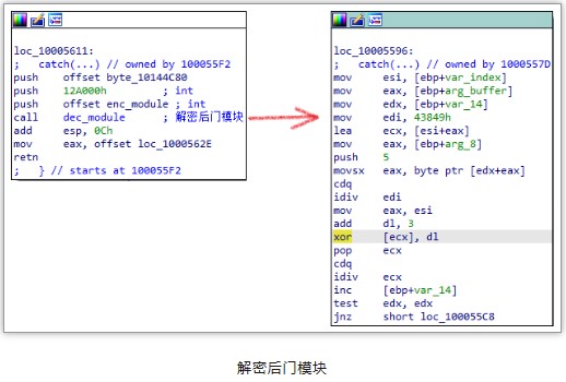 内层的后门模块采用了异或加密进行混淆。相关的解密代码,如下图所示: