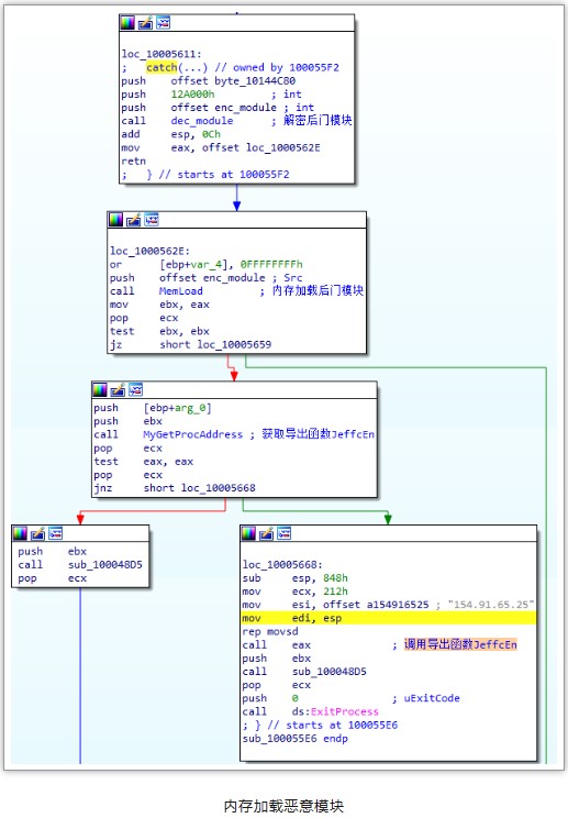 后门模块解密后将直接加载到内存中执行,而不会在磁盘上留下任何痕迹。这种方式使得其执行过程难以被传统的磁盘基础防御机制检测到,以此提高了其隐蔽性,相关代码,如下图所示: