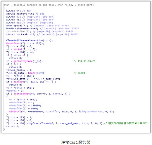 后门模块被加载后会主动连接C&C服务器(154.91.65.25),接收并执行C&C服务器下发的恶意指令,相关代码,如下图所示: