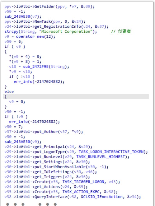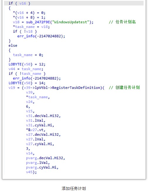 该病毒还会将自身添加到任务计划中,以实施持久化策略,从而达到在受害者电脑上持续运行的目的,相关代码,如下图所示: