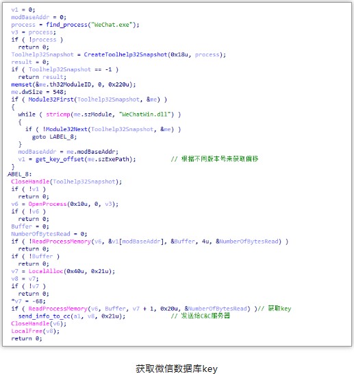 相较之前,最新变种增加了一些新的功能,例如,窃取微信数据库解密密钥、窃取QQ隐私信息、窃取Chrome浏览器数据等恶意功能。利用微信数据库密钥,攻击者能够解密受害者计算机上的微信数据库,从而获取受害者与其他人的聊天记录中的全部内容。通过这些信息,攻击者可以更有效地执行诈骗操作。获取微信数据库解密key并上传至C&C服务器,相关代码,如下图所示: