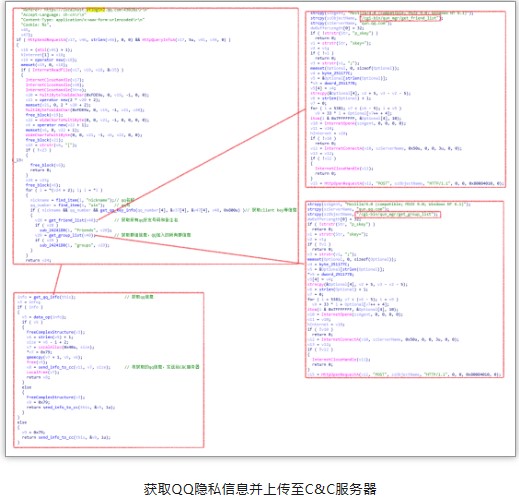 该变种还具有通过利用 QQ 快捷登录协议来获取本机登录的 QQ 相关信息的能力。这些信息包括但不限于 QQ 好友备注以及好友QQ 号、用户所加入的 QQ 群组等敏感信息。这些数据代表了用户的私人和社交生活的关键方面,其泄露可能会导致严重的隐私侵犯。与微信数据库解密密钥一样,攻击者可以利用这些信息来进行更有效的欺诈行为。获取qq隐私信息,并上传至C&C服务器,相关的代码,如下图所示: