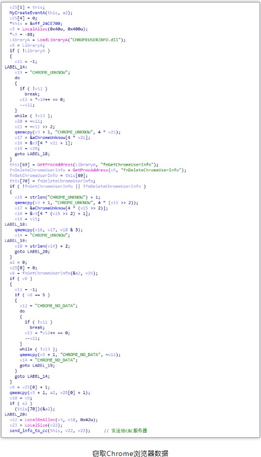 通过对病毒代码的分析,我们可以推测该病毒具有窃取Chrome浏览器数据的恶意模块。在安全人员的调试与分析过程中,尚未捕获到这个恶意模块,但不能排除病毒在后续会下发这个恶意模块的可能性。相关的调用代码,如下图所示: