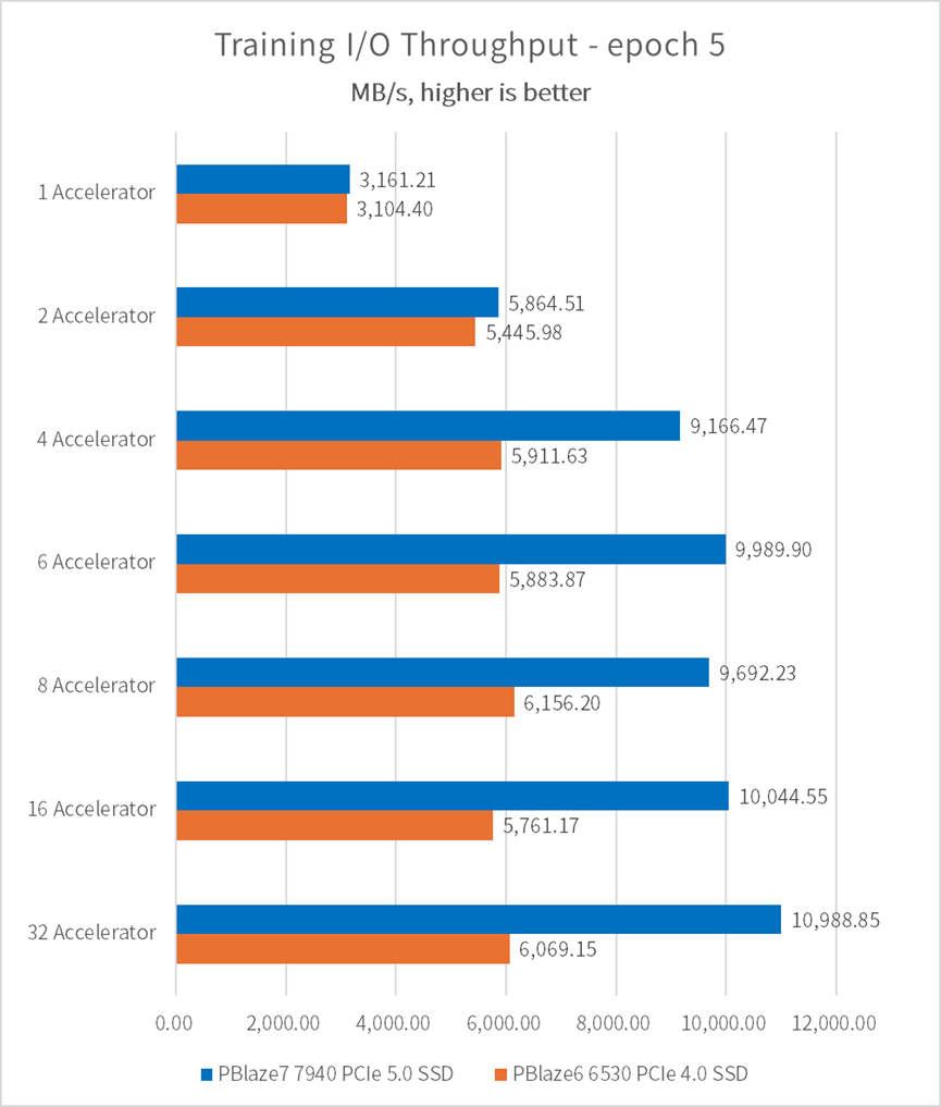 在 epoch=5 的情况下,通过配置单片 PBlaze7 7940 PCIe 5.0 SSD,可以在4颗或更多 GPU 的训练任务中,相比 PCIe 4.0 SSD 节省近1,000秒的时间。我们假设80个 epoch 为一次完整训练,节省时间则可以达到 16,000秒,并在80次完整训练下节省14.8天!
