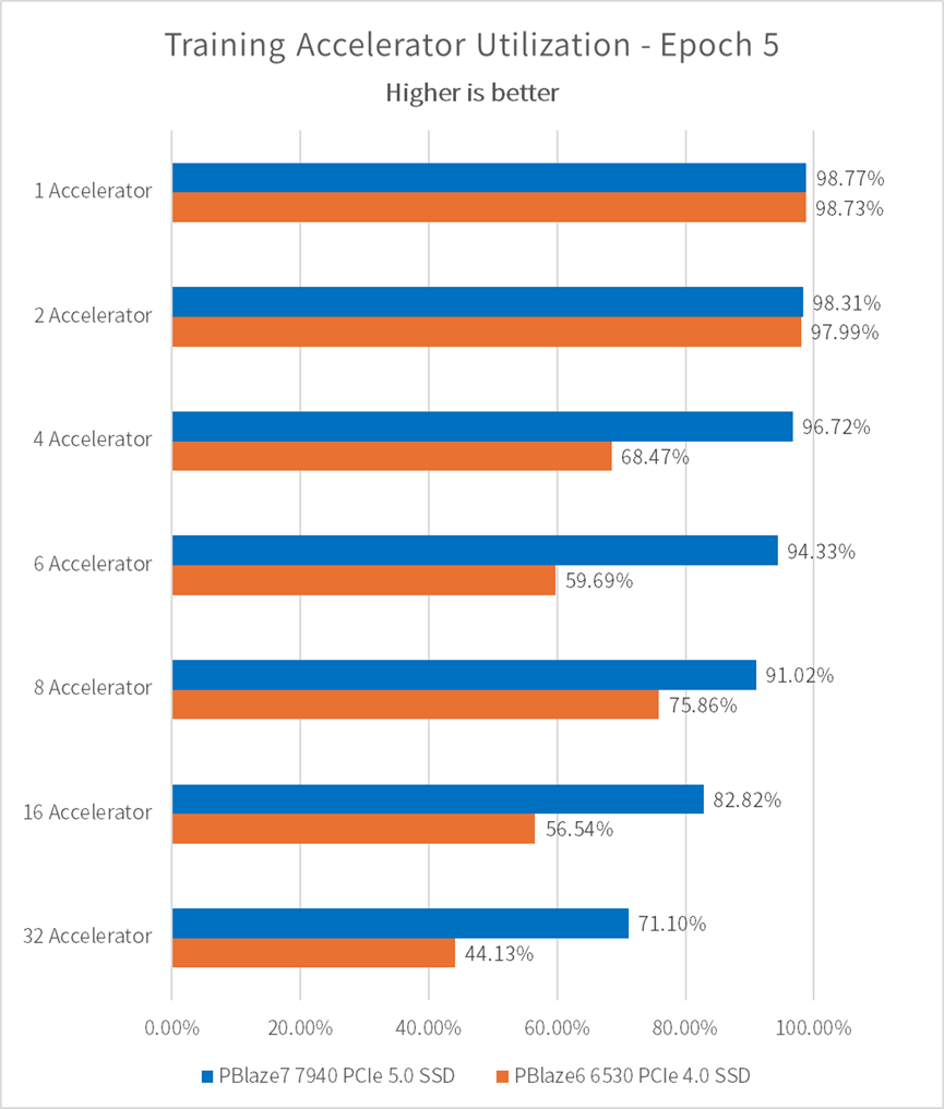 值得一提的是,尽管我们的测试仅使用了一片 PBlaze7 7940 PCIe 5.0 SSD,设定的每一个加速器对 I/O 性能的要求都很高,它仍然可以在8颗加速器的前提下,保证加速器的使用频率维持在 90% 以上!