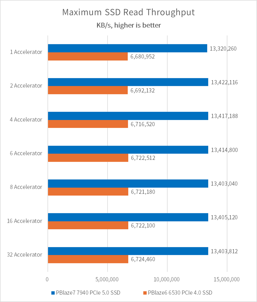• 单片 PBlaze7 7940 PCIe 5.0 SSD 可以在吞吐量较高的模型训练任务中,为多颗 GPU 配置带来优秀的 I/O 传输带宽,性能领先 PCIe 4.0 SSD 达 81%;