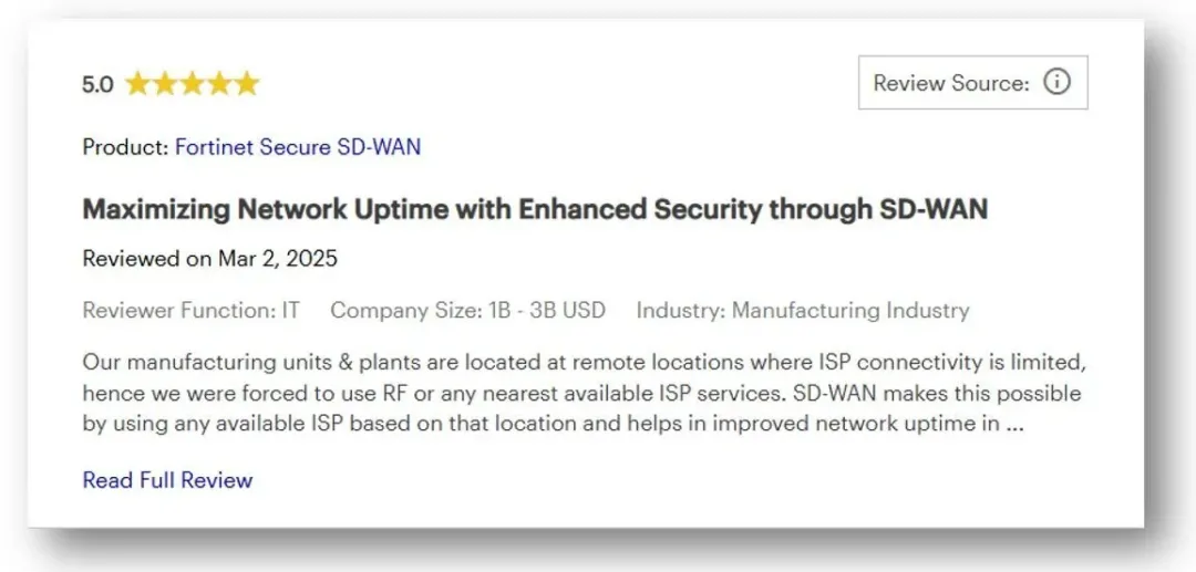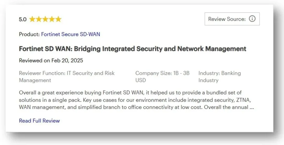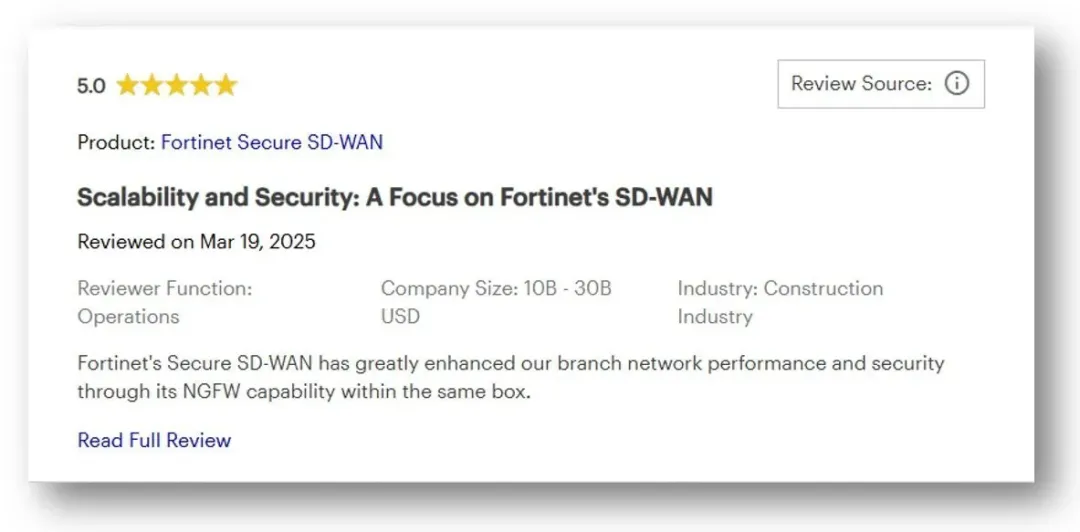 Gartner Peer Insights 平台上 Fortinet 安全 SD-WAN 用户五星评价示例: