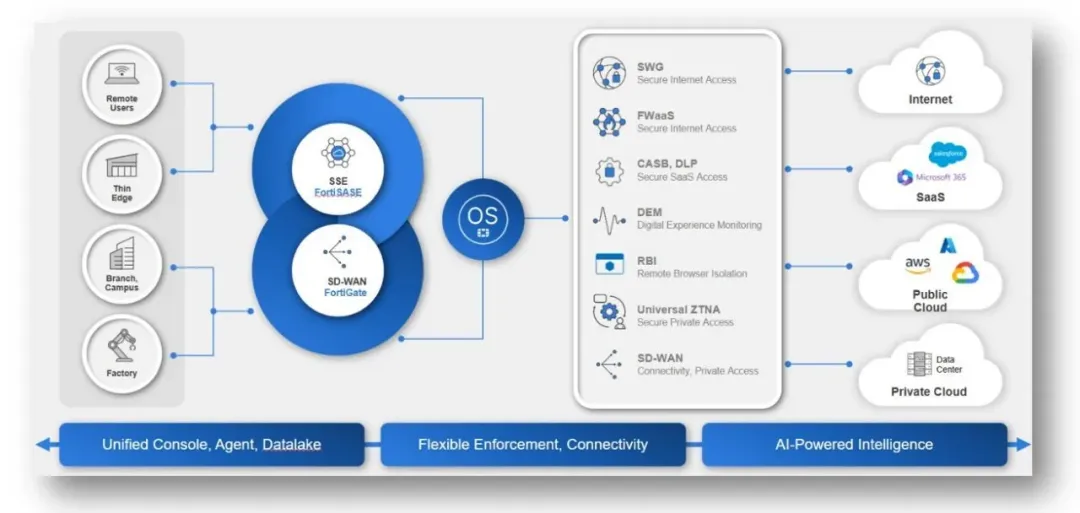 Fortinet Unified SASE 解决方案以“网安融合”为核心,具备多元化、融合化和统一化优势。全面整合统一操作系统 FortiOS 和统一终端代理,有效降低工具叠加部署导致的组网复杂性和运维成本。此外,还集成统一数据湖,有效增强威胁洞察和分析能力,并基于统一管理平台简化配置,轻松实现策略管理。