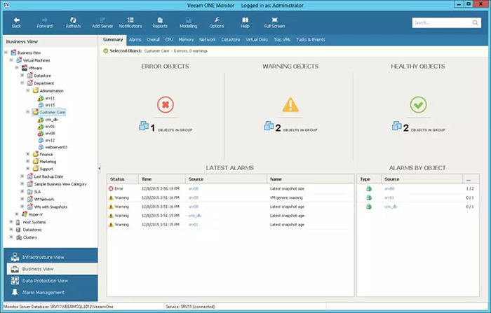 借助面虚拟环境的 24x7 全天候实时监控、报告、警报和管理,Veeam ONE 可帮助您避免停机和满足向备份和服务等级协议要求。您可访问: