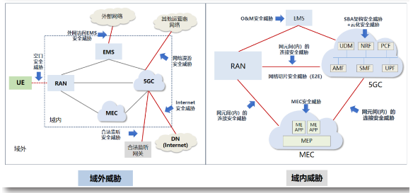 在域内威胁方面,用户需考虑网元间(内)的连接安全威胁、SBA架构安全威胁、O&M安全威胁、MEC安全威胁、云化安全威胁以及网络切片安全威胁,具体为: