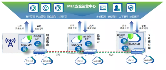 深信服5G场景下MEC安全能力建设方案,基于对运营商站点机房、边缘云、5G核心网等架构内基础平台、虚拟资源两个维度风险威胁的检测发现,通过安全事件日志上报、安全策略联动下发,实现5G MEC平台自身安全合规、MEC节点内安全(含容器)检测防护以及5G应用场景安全智能运营。