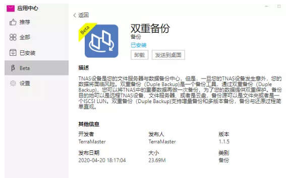 登录设备A,在TOS-应用中心-Beta下载并安装双重备份(Duple Backup)。