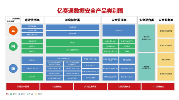 产品更新方面,亿赛通根据国家安全法规政策、国家等保安全需求,为用户提供全方位数据安全保障以数据资产防泄密为核心,以网络安全为基本框架;以协议识别解析为技术支撑;从应用场景出发,分为云、网、端三类,细分五大产品类别,包括:审计检测类、加密防护类、安全管理类、安全平台类、安全服务类等40余项产品板块,形成一体可视化态势感知数据安全智能管控平台,打造数据安全领域真正意义上的综合解决方案!