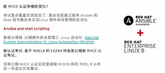 新版本RHCE加入了Ansible的认证内容。也就是说,新版本的RHCE的内容更加丰富、培训效果更好。