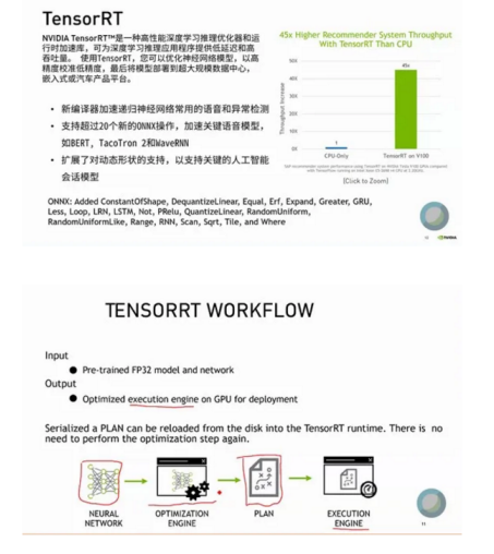 TensorRT 是一个高性能的深度学习推理(Inference)优化器,可以为深度学习应用提供低延迟、高吞吐率的部署推理。TensorRT 可用于对超大规模数据中心、嵌入式平台或自动驾驶平台进行推理加速。TensorRT 现已能支持 TensorFlow、Caffe、Mxnet、Pytorch 等几乎所有的深度学习框架,将 TensorRT 和 NVIDIA 的 GPU 结合起来,能在几乎所有的框架中进行快速和高效的部署推理。